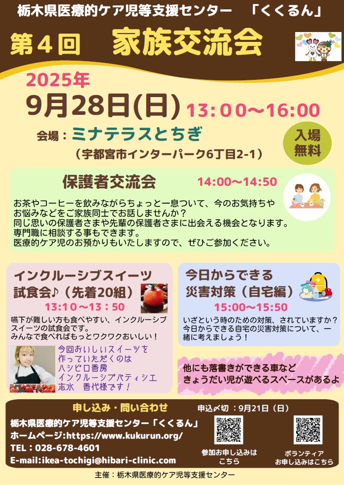 | 予約・申込先 | 【イベント】家族交流会2025のお知らせ – 栃木県医療的ケア児等支援センター「くくるん」 |