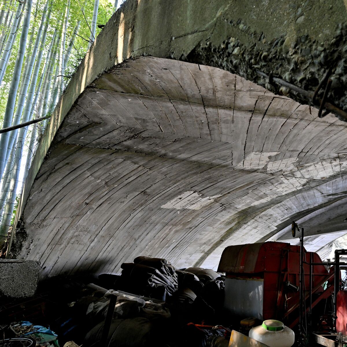 そんなひ行場のなごりを今につたえるのが、「えん体ごう」。コンクリートでつくられていて、大きなアーチがたをしているけんぞう物だよ。コンクリートの上には土がもられていて、木も生えているから、まるで山みたいに見えるかもしれないね。