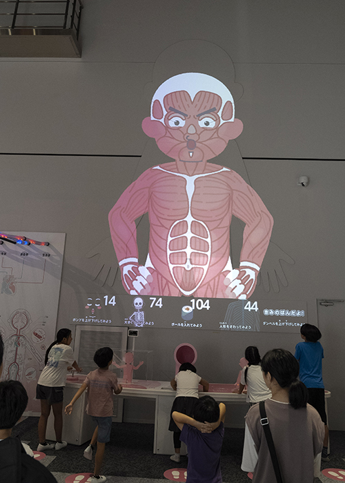 そして、「生命ゾーン」のシンボルてんじは、「シンクロナイズドヒューマン」。かべにうつった、7メートルもある「人間」が、体けんする人の動きに合わせて動くんだ。ほねやきん肉もうつし出すことができるから、みんなが動くと、ほねやきん肉がどう動くかよくわかるよ!